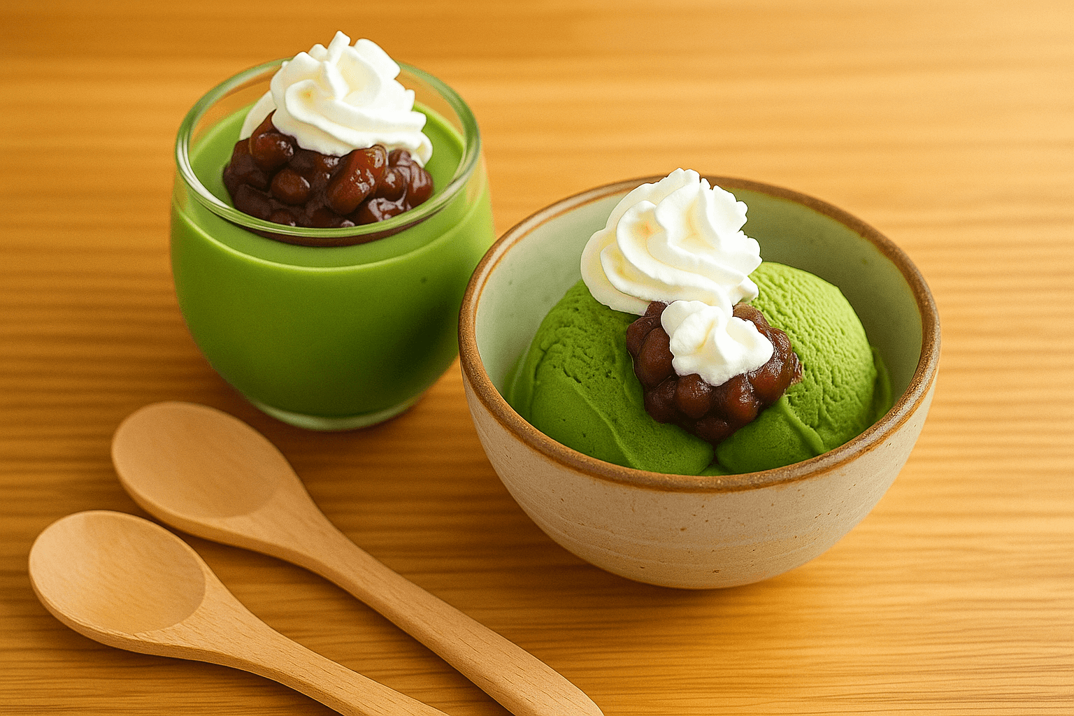 今回は抹茶アイスです。アイスの上にあんこをかけます。あと前回好評だった抹茶プリンも作ります。